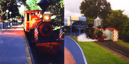 Granted, one might argue that it is not fair to criticize the left train for or not having a water tower, because the left train is a diesel train. Diesel trains do not need water towers, do they? Possibly, except that the left train is supposed to be a steam train. In a themed environment, an imitation steam train needs a water tower just as much as a real steam train does. Every detail possible must be reproduced for accuracy in a themed environment.