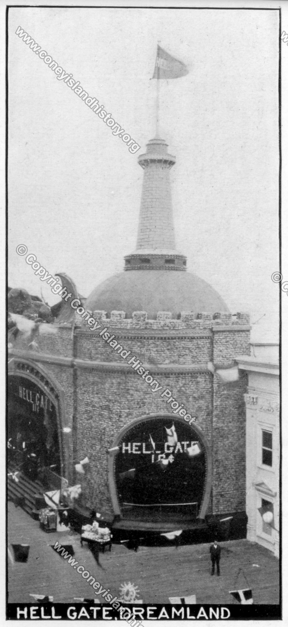 During my recent interview on coasterradio.com, the show host asked about some classic Coney Island attractions that didn’t get much detail in my Imagineering an American Dreamscape book. One of these was Creation, a thematic, immersive experience that was moved to Dreamland park in 1905 after the St. Louis World’s Fair ended. After witnessing the awe-inspiring birth of the world, visitors could then walk across the way and get sent straight to hell (and back) in Hell Gate. You couldn’t miss it, with the demonic satan glowering over the top of the building, its bat wings spread across the entire width of the facade. While standing in the queue, the open-front building clearly showed the poor souls ahead of them whose boats were savagely caught up in a swirling, deadly fifty-foot whirlpool that suddenly—before their very eyes—sucked them down out of sight into the bowels of the earth.