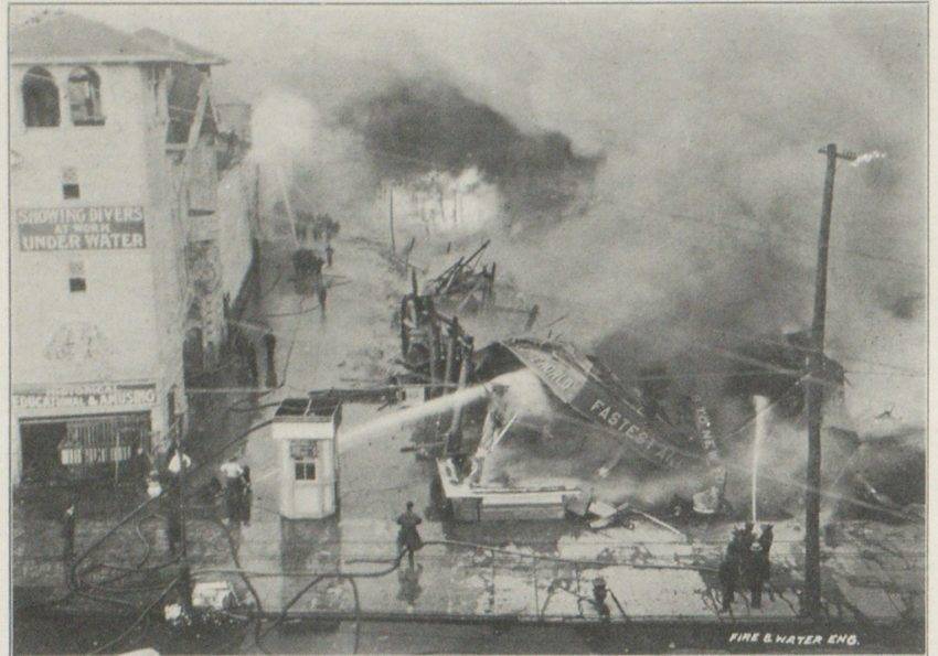 All was just dandy until late one night in 1911. The park was set to open the following morning for the new season and workers were patching the boat trough. Apparently hot tar got knocked over, light bulbs began exploding for whatever reason, and everything—everything—went up in flames. As in the entire park. People came from all around to watch the spectacle. Dreamland was equipped with a state-of-the-art fire suppression system, a product of the region’s history with major fire issues. But as other nearby properties realized the danger, they also tapped into the water mains to hose their places down. The result was too little water pressure at the park, effectively dooming it to extinction. When reinforcements finally arrived, both on land and from fire-fighting ships, it was clearly a goner, so they focused attention on protecting everything else around it.
