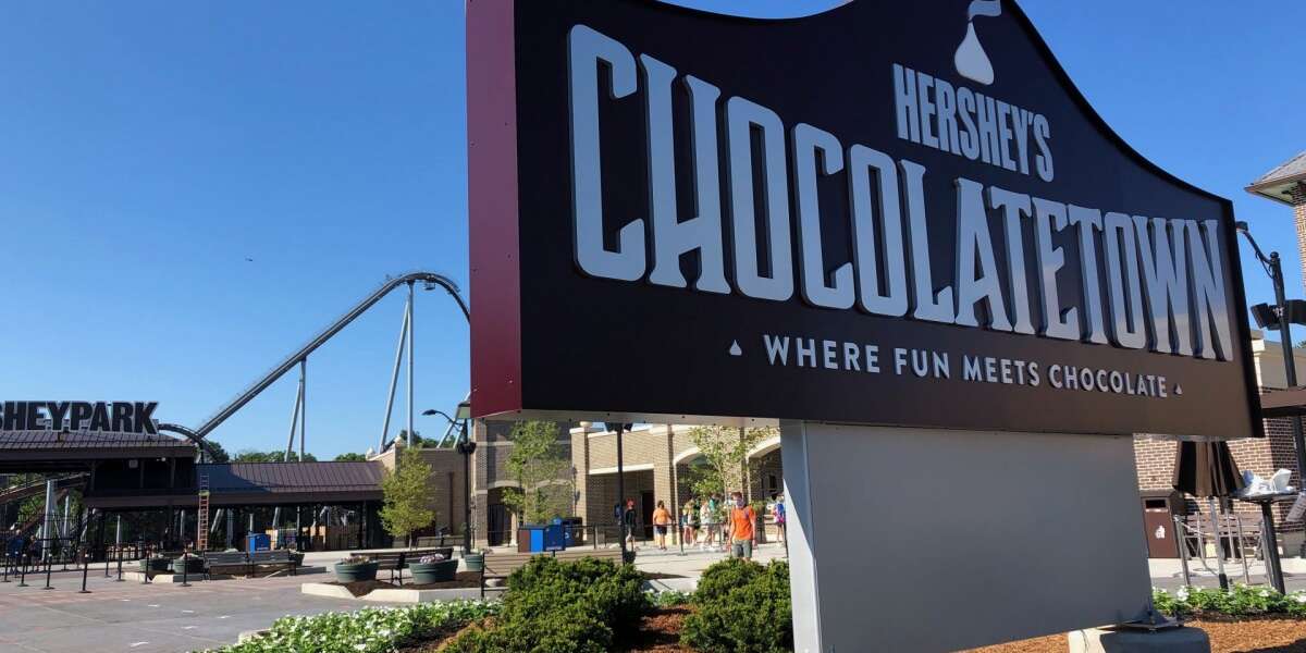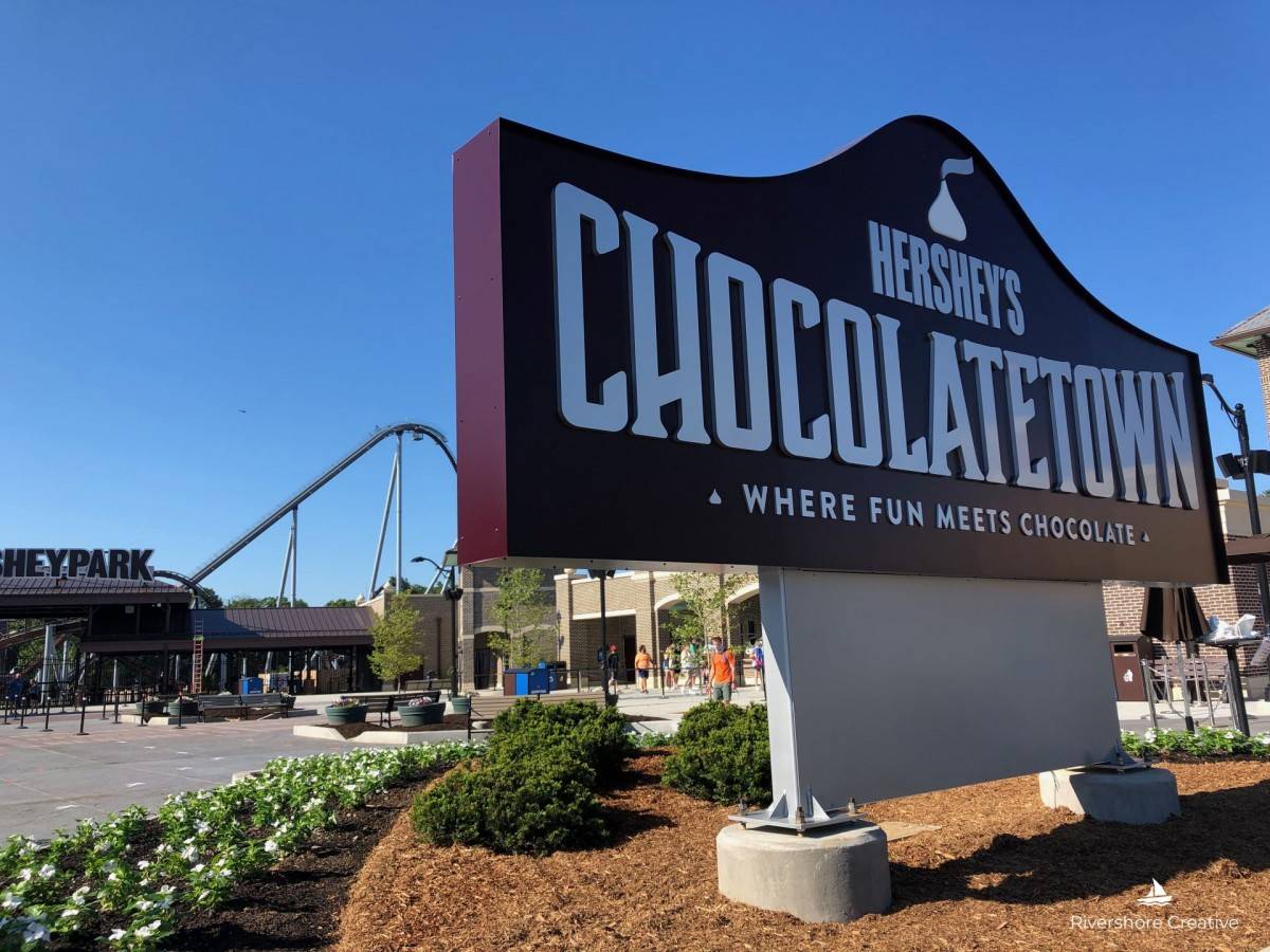 The grand Hershey’s Chocolatetown sign welcomes you to the spacious new themed area. Major retail and dining opportunities are located just outside the park gate, providing a year-round experience. Brick is everywhere, the architectural design paying tribute to historical downtown Hershey, with lots of details borrowed from the old chocolate factory and other buildings. The embedded compass, just in front of the park entrance, features brass plaques full of history.