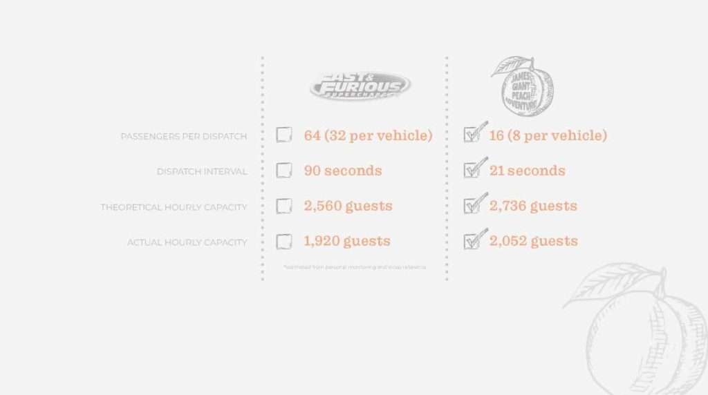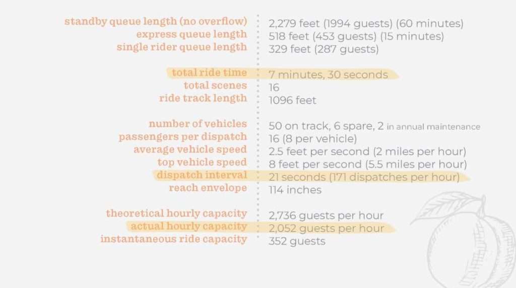 As required, with the timing sequence of the ride, and using the loading technology provided by Oceaneering, this attraction can withhold an actual hourly capacity of over 2000 guests, proving to be a higher capacity than the existing attraction.