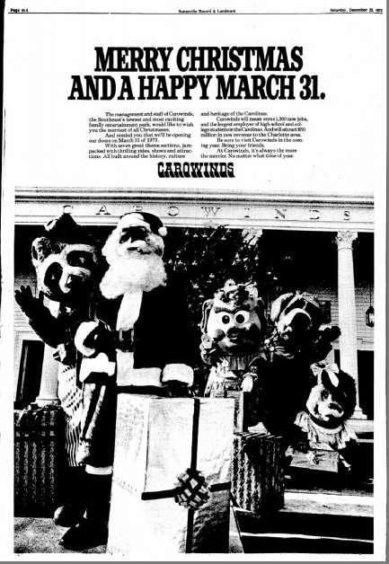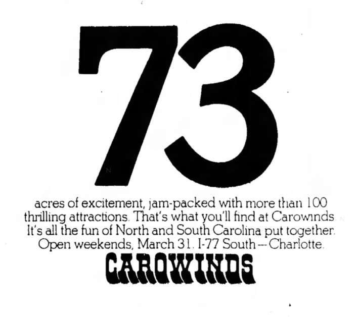The new state-straddling, Disneyland-lite park dedicated to the Carolinas was scheduled to open in 1972 after breaking ground in 1970. The weather had something to say about that, though, and so things were pushed back a year. Finally on Saturday, March 31, 1973, Carowinds proudly braved a dismal, rainy day and swung open the gates to an enthusiastic, under-sized crowd.