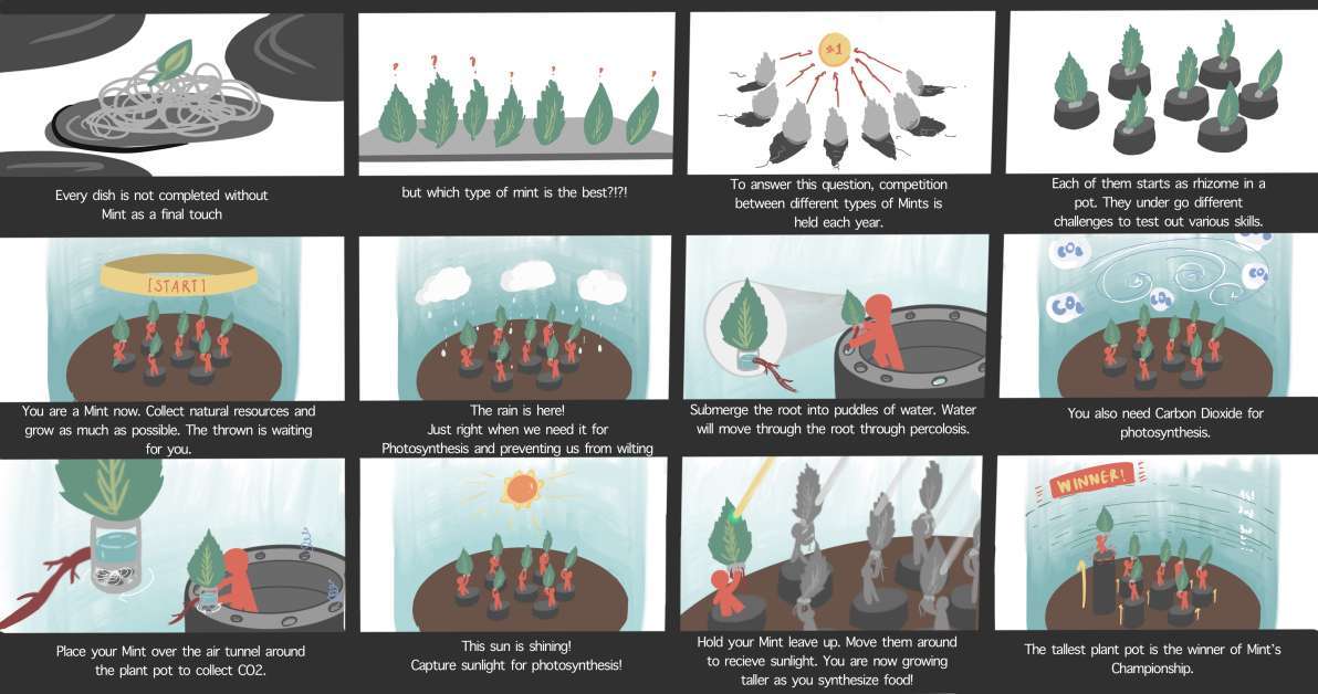“Mentha Mintfolia” is our newly developed species of mint, derived from mint plants of the past. We developed it to grow taller and stronger, in order to enhance the health properties of the plant. Common uses of mint include additions to dishes to provide fragrance, and it has properties to improve your digestive health, immune system and more. “Mentha Mintfolia” requires water, wind and sunlight to grow. Through photosynthesis, the plant is then able to convert the sunlight into food for growth, growing bigger and taller than previous varieties of mint have ever done. We would like you to experience firsthand how water, wind and sunlight affects the growth of “Mentha Mintfolia” and so put on your Mintfolia sapling gloves and come along with us on a ride to discover new heights. Let’s see who can become the strongest and tallest Mintfolia of all!