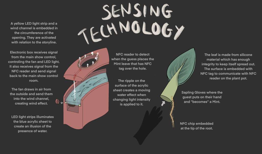 To elaborate on the sensors used in the slots, NFC technology is used where NFC tags is located on the sapling gloves, and NFC readers located in the plant pot. When the storyline requests for a particular resource, the reader will look for a specific NFC tag. For example when water is requested, the NFC reader will identify that the tag attached to the root of the sapling is to be detected for the command to pass. The reader sens signal to the gears to rotate and the plot moves upward. The NFC reader is placed on the pot to allow for faster communication speeds between the hardware used, allowing for a positive feedback loop that is more responsive to the user’s commands.