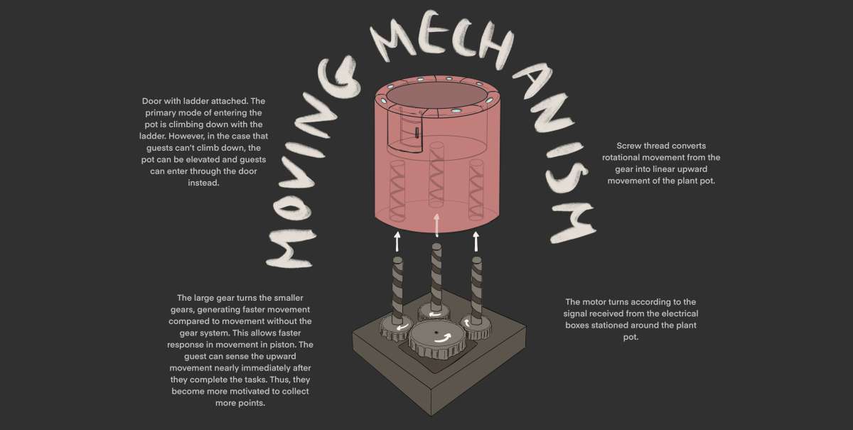 The working mechanism behind the pot is a screw thread mechanism. It converts the rotational movement of the gear into an upward linear motion. I have chosen it ahead of other mechanisms due to its low cost of maintenance and low usage of space.